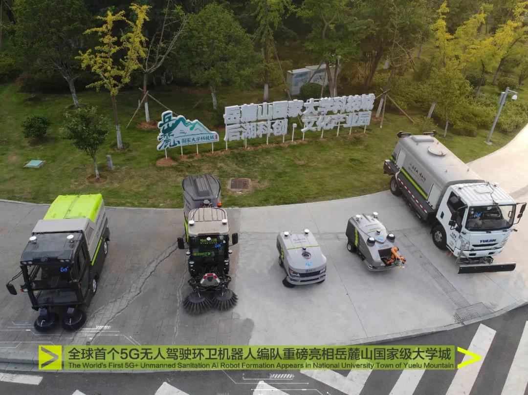 2019年8月,全球首个5G无人驾驶环卫机器人编队亮相岳麓山国家大学城。