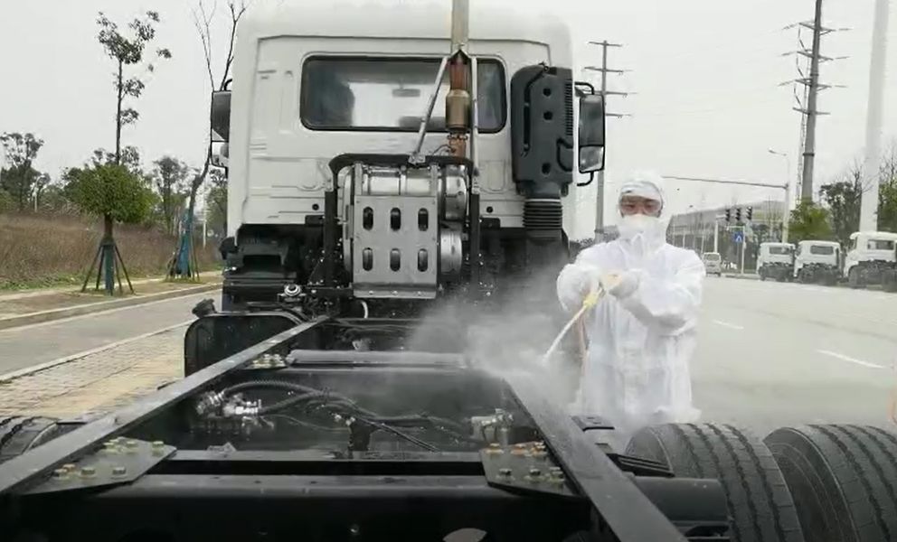 东风商用车生产基地在湖北十堰疫情重灾区,东风商用车的物流司机将底盘车送至湖南境内的高速路口岳阳北收费站后返回湖北集中隔离,再由好博环境的物流司机接回厂区。整个交接运输过程中,每一辆底盘车在出厂、高速路口、好博环境长沙园区必须经历三次的专业消毒,确保安全,万无一失。