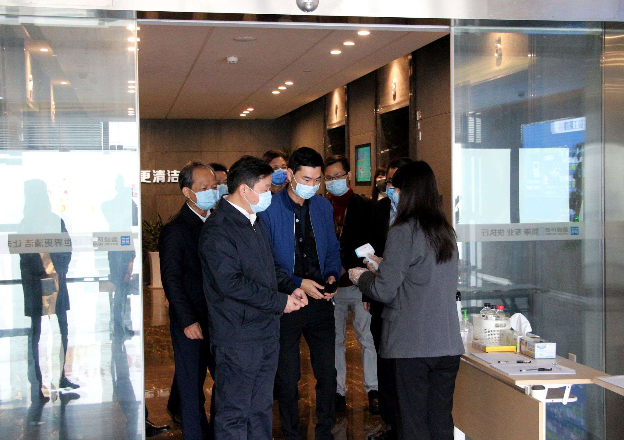 朱伟市长一行到达好博环境,首先配合好博环境的体温检测岗经过了严格的测量后,进入到企业办公区、会议室等区域,就企业的防疫物资、防疫制度文件、员工信息登记台账等情况进行了全面的调研与检查。